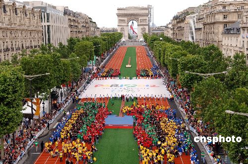 6月5日,法國(guó)巴黎香榭麗舍大道被裝扮成巨型競(jìng)技場(chǎng),數(shù)萬(wàn)巴黎人聚集于此,期盼巴黎申辦2012年夏季奧運(yùn)會(huì)能夠成功。作者:Ic/cnsphoto