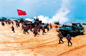 午后,一天中最熱的時候,趁著海水漲潮,官兵開始了游泳訓練。記者看到,在正面寬約5公里的海灘上,全旅官兵長龍似的排開,露出一片黝黑的鋼鐵般的脊背。隨著一顆信號彈升空,數(shù)千名官兵同時下海,場面很是壯觀。官兵們奮力劃水,漸游漸遠,變成波峰浪谷中若隱若現(xiàn)的一個個黑點。該旅的游泳訓練,上至旅長、政委,下至駕駛員、炊事兵,全旅官兵都要下海。記者在海邊看到,被譽為“兩棲作戰(zhàn)先鋒”的裝甲團團長陳昌鋒帶頭下海,身上被水母蜇出大片大片的紅疹。