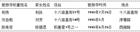 官麗珍根據(jù)在廣州市檔案館查閱的檔案,在書中列舉了檔案中記載的三名中國(guó)幼童的姓名、家長(zhǎng)姓名、地址、被掠奪時(shí)間和地點(diǎn)(詳見左表)。這些兒童都是在廣州市警察局轄內(nèi)被日軍掠走的。官麗珍認(rèn)為,當(dāng)年日軍擄掠殘殺兒童是常事,但一次性掠走這么多兒童,比較典型。她同時(shí)表示,日軍劫掠兒童雖是在日本投降之前,但很難證明日軍意識(shí)到要投降才大肆捕捉,為戰(zhàn)后青壯年補(bǔ)充之用。因?yàn)槿毡咎旎什徽f(shuō)戰(zhàn)敗,日軍也許還認(rèn)為自身形勢(shì)不錯(cuò)。