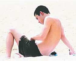 據(jù)報(bào)導(dǎo),陳冠希上周三(6月1日)下午4點(diǎn)左右,他一個(gè)人到香港淺水灣的海灘做日光浴,先是從手提袋中拿出一大條白毛巾、防曬油,然后開始脫掉背心,涂防曬油,涂完防曬油就躺在毛巾上曬太陽(yáng),后邊打電話邊抽煙,優(yōu)閑地享受日光浴。