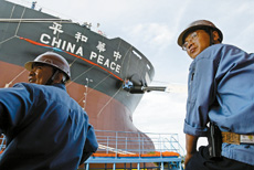 2003年6月,“中國航運(yùn)股份有限公司”向上海外高橋有限公司訂造了兩艘17.5萬噸好望角型散貨船,今天命名交付的“中華和平”號(hào)便是其首制船。它比原定日期提前110天完工交船,并將于今天下午啟航向首航目的地、南非理查德灣進(jìn)發(fā)。