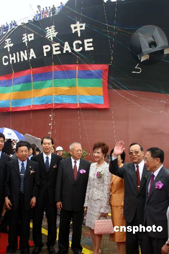 臺灣船東直接在祖國大陸訂造的第一艘船“中華和平”號十日在滬舉行盛大的命名交船儀式,圖為全國政協副主席董建華、中國國民黨主席連戰(zhàn)夫人連方瑀女士等專程趕來見證海峽兩岸這一重要的歷史性時刻,并在“中華和平”號前合影留念。作者:孫自法
