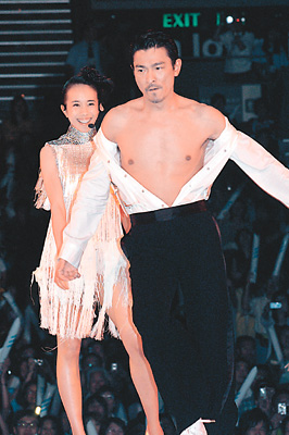 早前彩排時(shí),Karen已透露會(huì)跟靚仔嘉賓劉德華大跳辣身舞,當(dāng)晚雖然男友馮德倫出現(xiàn)監(jiān)場(chǎng),惟不影響Karen的豪放表演。與“華仔”跳辣身舞時(shí),動(dòng)作大膽,只見“華仔”自Karen的玉背一直摸到她的屁股位置,看得觀眾嘩聲四起;跟著她更投向“華仔”的懷抱,將長(zhǎng)腿鉗住對(duì)方,繼而慢慢將“華仔”的衣衫逐件脫下來(lái)。與此同時(shí),“華仔”亦不甘示弱,把Karen的外衣脫去,剩下一條貼身低胸的白色連身裙;Karen亦一手把“華仔”的恤衫扯開,令“華仔”兩點(diǎn)盡露,全場(chǎng)觀眾尖呼狂叫。被脫光上衣的“華仔”即轉(zhuǎn)返后臺(tái),而兩位男舞蹈員出場(chǎng),繼續(xù)把Karen的長(zhǎng)裙除去,最后只剩下白色bratop和短褲,非常誘惑。