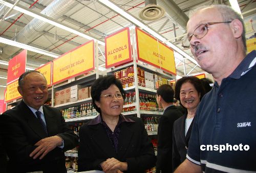 中國國務院僑辦主任陳玉杰(左二)一行當?shù)貢r間六月十一日來到法國華人最大的企業(yè)之一陳氏兄弟公司總部參觀,同陳氏集團董事長陳克威(左一)進行了會談。圖為陳玉杰與購物的法國顧客交談。作者:鐘誠