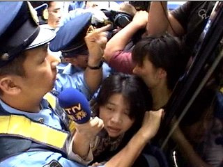 游覽車被現(xiàn)場(chǎng)日本的強(qiáng)勢(shì)警力包圍,有記者決定下車拍攝,不過就在下車瞬間,日本警察就一擁而上,女記者被推擠的像沙丁魚一樣,扭曲變形,日本警察就是不準(zhǔn)臺(tái)灣媒體下車采訪,這時(shí)一位攝影記者只好跳車,但還是被日本警方再推回車上。