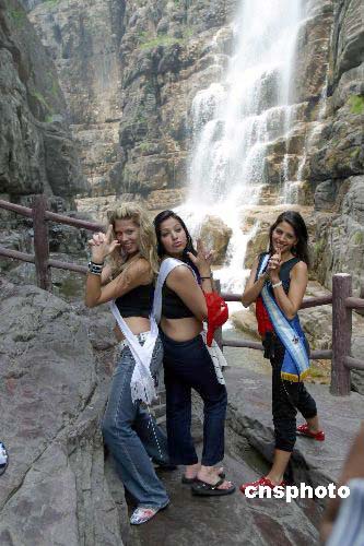 六月十四日,國際旅游小姐大賽參賽佳麗在云臺山天瀑下留影。國際環(huán)球旅游小姐河南巡游行最后一站在河南焦作云臺山世界地質公園,云臺山園區(qū)是中國國家森林公園,世界地質公園,山勢險峻、溝壑縱橫、常年云纏霧繞。擁有紅石峽、泉瀑峽、云臺天瀑、潭瀑峽、情人瀑等具有世界地質特征的重要景點。