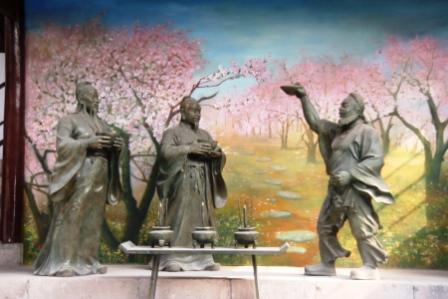 踏上陡峭的臺階走上二樓,劉、關(guān)、張?zhí)覉@三結(jié)義的雕塑面江而立,率先映入眼簾。三人神態(tài)栩栩如生,背后桃花掩映,給人意氣風(fēng)發(fā)之感覺。周圍畫廊多為名家字畫雕刻,各處樓板都有白色標(biāo)注,蓋取舊址之原樣翻蓋如此。三樓大殿當(dāng)中為張飛銅像,此前泥塑無法整體遷移,匠心獨具之雕塑家仿照原樣,雕刻成張飛青銅座像。銅像若有所思,仿佛正在為蜀漢江山、百姓安樂遐思。銅像周圍有張飛四個歷史時期泥塑,主題分別為鞭打都郵、義釋嚴(yán)顏、大戰(zhàn)長坂坡及閬中遇難。