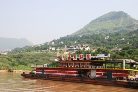 筆者一行自云陽新城的南岸驅(qū)舟,橫穿長江抵達南岸的張飛廟碼頭。船行長江,江上風(fēng)清日烈。談笑間,舟已至南岸。棄舟登岸,拾階而上。路陡且窄,兩邊多仿古店肆,店家小販叫賣不斷。烈日如炙,同行者皆汗流夾背。