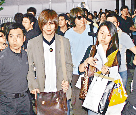 當(dāng)言、周二人出閘,fans欣喜若狂,場(chǎng)面一發(fā)不可收拾,三十多名保安、十多名警察嚴(yán)陣防亂,F(xiàn)場(chǎng)所見(jiàn),明顯以言承旭fans的聲勢(shì)比周渝民強(qiáng)勁得多,難怪言承旭不時(shí)風(fēng)騷地向群眾揮手,反觀周渝民則頭耷耷,無(wú)厘神氣。最后二人在保安筑成人墻護(hù)送下登車離去。