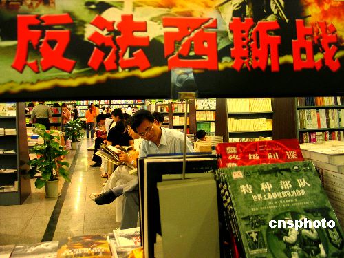 6月18日,南京某書(shū)城為紀(jì)念中國(guó)抗日戰(zhàn)爭(zhēng)暨世界反法西斯戰(zhàn)爭(zhēng)勝利60周年,在店堂內(nèi)設(shè)立了反法西斯戰(zhàn)爭(zhēng)主題書(shū)展,受到讀者歡迎,每天都吸引百余位讀者。作者:鐘山
