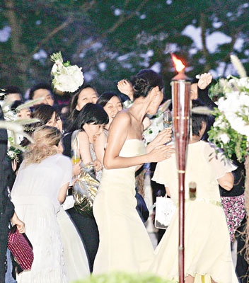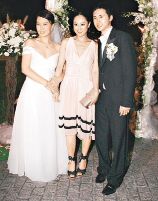 新娘子Stephanie平日為旗下藝人做慣幕后軍師,前晚輪到她當(dāng)主角,她喜孜孜地說:“婚宴請了二百五十人,擺了二十五桌,Gigi送手鐲、莫文蔚送耳環(huán)、蔣怡送飾物、楊采妮送的好有心思,但我不會講是什么。最開心天心都由臺灣來香港,楊采妮更陪我挑選結(jié)婚戒指,Gigi尋晚陪著我整晚,幫我想問題考新郎。拋花球時我想另外一個圈外人接到,又想天心接到,因為她同男友一齊來!