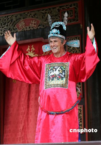 六月二十一日,前中國足球隊主教練米盧蒂諾維奇來到中國著名水鄉(xiāng)周莊參觀游覽,并穿起戲裝登臺做秀。作者:毛建軍