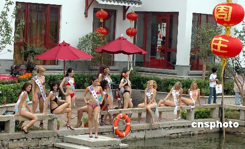 六月二十二日,參加國(guó)際旅游小姐最佳民族服裝冠軍大賽的七十五位佳麗在“中國(guó)第一水鄉(xiāng)”古鎮(zhèn)周莊奉獻(xiàn)了一場(chǎng)比基尼泳裝秀,盡情展示她們大膽、外向的美麗。作者:蔣振江