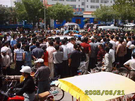 接到報(bào)料后,記者隨即趕往現(xiàn)場。在現(xiàn)場記者看到,有五六百名群眾圍住一輛警車,車內(nèi)坐著三個(gè)人,身著便裝。周圍群眾將警車層層包圍住,異常憤怒地叫喊著,讓車?yán)锏募倬斐鰜。不遠(yuǎn)處停著幾輛張掖警方的110警車,正在維持現(xiàn)場秩序。
