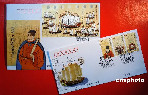 二00五年,中國政府隆重紀(jì)念明初中國航海家、和平史者鄭和率領(lǐng)萬人船隊下西洋600周年。中國國務(wù)院特別批復(fù)了交通部倡議的七月十一日定為“航海日”。北京市郵票公司為配合國家郵政局于六月二十八日發(fā)行《鄭和下西洋600周年》紀(jì)念郵票(1套3枚),特設(shè)計、印制了該郵票的首日封(右)、小型張首日封(左)等精制郵品,并與郵票同日發(fā)行。作者:鄒憲