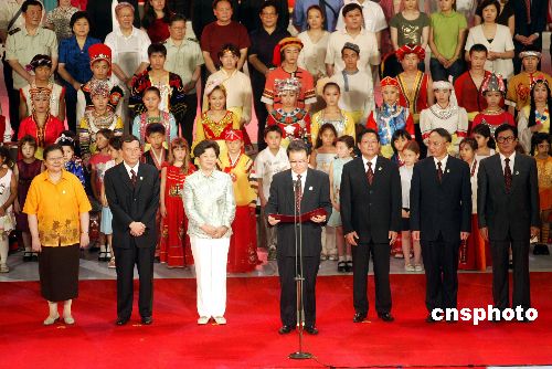 六月二十六日,北京二零零八年奧運(yùn)會(huì)主題口號(hào)在北京工人體育館舉行發(fā)布儀式,“同一個(gè)世界 同一個(gè)夢(mèng)想”(One world One dream)成為主題口號(hào),圖為中共中央政治局常委李長(zhǎng)春(中)發(fā)布該主題口號(hào)。作者:盛佳鵬
