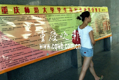 重慶師范大學(xué)學(xué)生處張老師介紹,《管理規(guī)定》是嚴(yán)格遵守重慶市教委《高等學(xué)校制定和修改學(xué)生管理制度》中第四十二條“有損大學(xué)生形象、有損社會公德”的精神來修訂的,于5月22日正式試行,6月中旬制成展板,放到學(xué)生出入較多的一教樓,希望學(xué)生發(fā)表自己的看法。但是,直到昨日,沒有一個學(xué)生到學(xué)生處反饋意見。