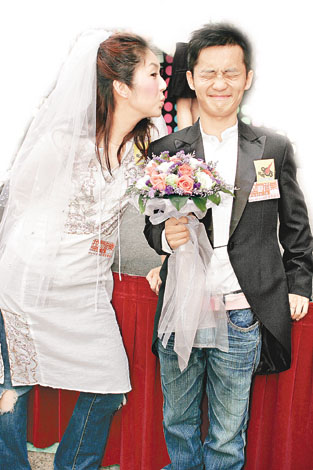 中新網(wǎng)6月28日電 據(jù)香港媒體報道,楊千嬅和林一峰昨日到銅鑼灣,出席《拉闊音樂會》的露天記者會,兩人以新郎新娘造型出現(xiàn)扮結(jié)婚,他們更即場作狀簽字和交換戒指,但簽字時突然下雨,搞到兩人十分狼狽,千嬅笑言連老天都反對兩人結(jié)婚,當(dāng)千嬅讀誓詞時又忍不住笑,最后她把花球拋給林一峰。