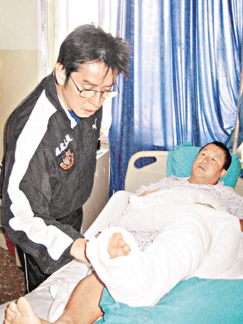 “香港明星足球隊”前日與“中國明星足球隊”于北京進行友誼賽,結(jié)果落敗之余,志偉及張兆輝更受傷收場,志偉被對方隊員踢中左腳,痛得未能站起來,最后要用擔架抬離現(xiàn)場,隨即送院治理,經(jīng)醫(yī)生診斷后需馬上進行手術(shù),幸好一切順利,據(jù)其主診醫(yī)生透露,志偉傷勢并不嚴重,大約休息七天,待完全康復(fù)后更可繼續(xù)踢球。