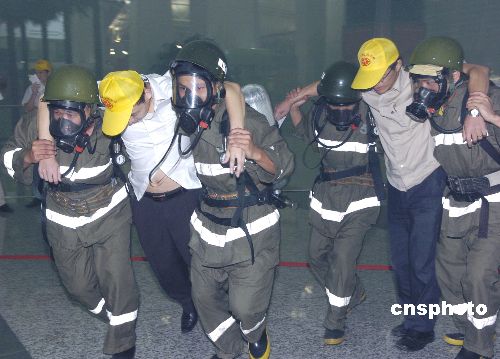六月二十九日晚十時,廣州新白云國際機場首次進行火災(zāi)應(yīng)急救援演練,以檢驗新機場的應(yīng)急能力和各單位的配合情況。圖為救援人員到場搶救受傷旅客。作者:羅仰明