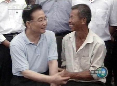 在蒼梧縣龍圩鎮(zhèn)中村,溫家寶深入田間地頭查看災(zāi)情,與農(nóng)民促膝交談。