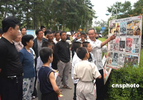 7月4日,牡丹江市空調(diào)機(jī)廠退休職工李易智把精心準(zhǔn)備的抗戰(zhàn)勝利60周年畫板向市民展出,這是他連續(xù)6年的第600多場(chǎng)展出。作者:張克非