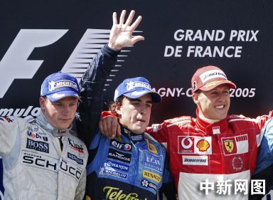 7月3日雷諾車隊的西班牙車手阿隆索(中)、法拉利車隊的德國車手舒馬赫(右)、與邁凱輪車手萊科寧在法國Grand Prix賽車Magny-Cours跑道上進行比賽。雷諾車隊阿隆索贏得了這場比賽。