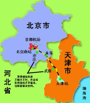 專家介紹,京津城際軌道交通工程由北京南站東端引出,沿既有京山鐵路線南側(cè)向東,過亦莊工業(yè)園區(qū)、永樂新城至天津楊村后,再沿既有京山線北側(cè)至天津站。此線建成運(yùn)營(yíng)后,最小行車間隔為三分鐘,北京、天津間全程直達(dá)運(yùn)行時(shí)間為半個(gè)小時(shí)左右。
