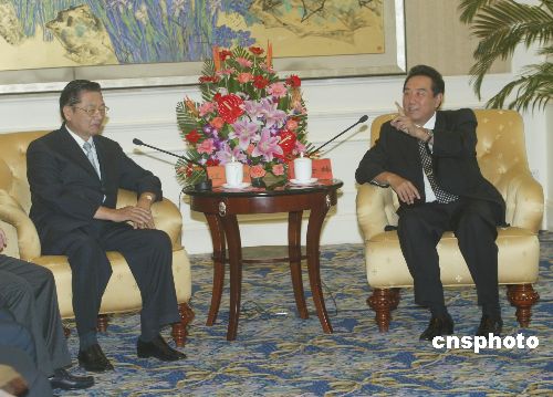 七月五日,中共中央臺(tái)辦主任陳云林在北京飯店會(huì)見臺(tái)灣華聚產(chǎn)業(yè)共同標(biāo)準(zhǔn)推進(jìn)基金會(huì)董事長(zhǎng)江丙坤。江炳坤率臺(tái)灣方面五十三人參加“海峽兩岸信息產(chǎn)業(yè)技術(shù)標(biāo)準(zhǔn)論壇”。作者:史利