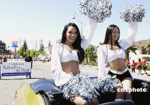 美西佛里蒙特市舉行七月四日“永遠(yuǎn)的星條”國慶節(jié)游行,圖為游行隊列中的美女啦啦隊員。作者:陳鋼