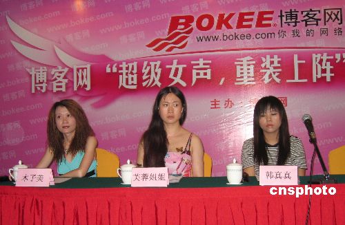 七月五日,由博客網(wǎng)主辦的“超級(jí)女聲重裝上陣”活動(dòng)新聞發(fā)布會(huì)在北京舉行。備受中國(guó)內(nèi)地網(wǎng)民關(guān)注的歌手韓真真(圖右1)全程代言此次比賽!熬W(wǎng)絡(luò)紅人”木子美、芙蓉姐姐、流氓燕、竹影青瞳等作為嘉賓進(jìn)行全程賽況點(diǎn)評(píng)。