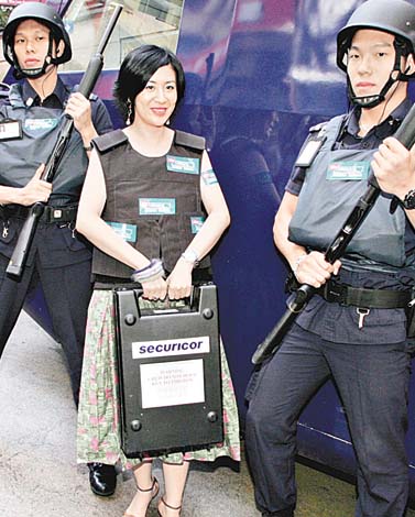 為配合大會抽獎送鉆的主題,雖然只安排了大袋的仿鉆,但仍動用了正規(guī)保安公司護(hù)送。兩名保安員荷槍實彈左右護(hù)駕,由于途中路面不平,令君如十分擔(dān)心槍枝會否在碰撞下走火,她說:“支槍撞撞 ,都有想過會不會走火。這個感覺都好像真的, 以為自己拍戲時候的感覺!
