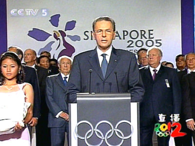 主辦城市選舉的懸念留到了最后一輪,由倫敦“決斗”同樣強(qiáng)大的巴黎。在這輪的投票選舉中,雙方?jīng)]有讓國際奧委會(huì)主席羅格難堪的戰(zhàn)成平手,而是高下立分。在經(jīng)過一段讓人幾乎窒息的等待之后,一位華裔新加坡女孩把放有結(jié)果的信交給了羅格。羅格在感謝了東道主新加坡民眾、此前提出申請(qǐng)的國家和五個(gè)候選國家后,向世人大聲宣布:國際奧委會(huì)決定,把第30屆奧運(yùn)會(huì)的主辦權(quán)交給倫敦!