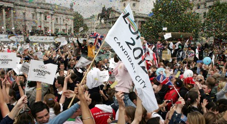 北京時(shí)間7月6日,倫敦?fù)魯“屠琛ⅠR德里等城市后,成為第30屆奧運(yùn)會的主辦城市。在得知?jiǎng)倮南⒑螅瑐惗厥忻窦娂娪可辖诸^,慶祝這次得來不易的勝利。圖據(jù)路透社