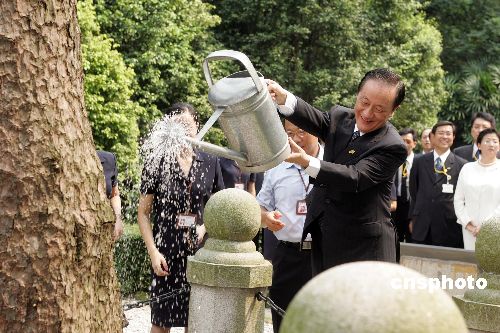 新黨主席郁慕明率領(lǐng)的新黨“民族之旅”訪問團(tuán)七月七日拜謁廣州黃花崗七十二烈士陵園,并向一九一二年孫中山先生種下的馬尾松澆水培土。作者:毛建軍