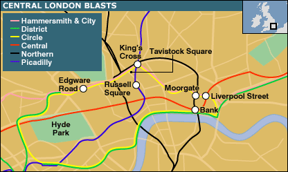 12點56分,英國內(nèi)政部官員告訴下議院,“一些恐怖分子攻擊”了倫敦中部。其中包括至少四次的爆炸。其中三起發(fā)生在地鐵,一起發(fā)生在公共汽車。羅素廣場和國王十字車站、摩爾門(Moorgate),歐德門和利物浦大街車站(Aldgate and Liverpool Street Underground),愛德華爾路車站(Edgware Road station和發(fā)生巴士爆炸的達維斯托克廣場(Tavistock Square)。