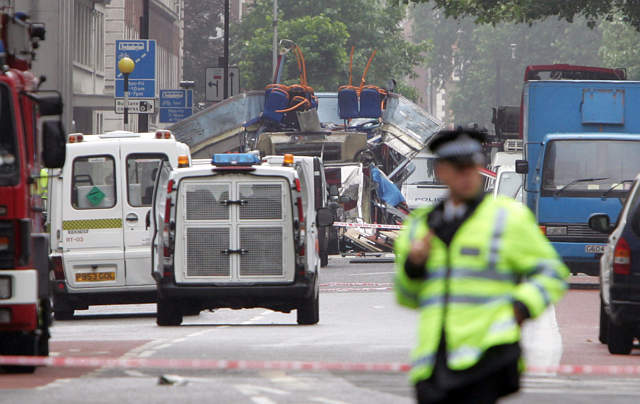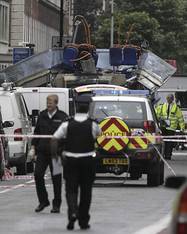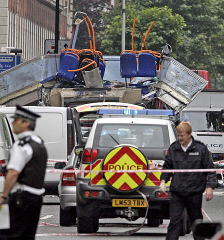 中新網(wǎng)7月7日電 英國警方稱,至少有兩人在今天倫敦公共汽車和地鐵發(fā)生的六起爆炸案中喪生。圖為在地鐵發(fā)生爆炸后在倫敦阿爾德加特東站門前工作的警察和消防隊(duì)員。(春風(fēng))