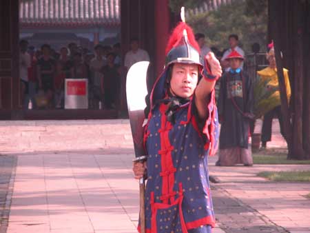 中新網(wǎng)7月9日電 在承德避暑山莊,每天早上八點(diǎn)“開園”時(shí)都會(huì)舉行熱鬧的清朝宮廷古裝儀式表演。