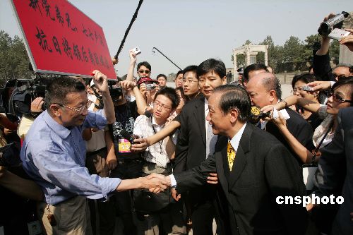 臺灣新黨“民族之旅”訪問團七月十一日在北京參觀盧溝橋時,新黨主席郁慕明與歡迎他的民眾握手交談。作者:毛建軍