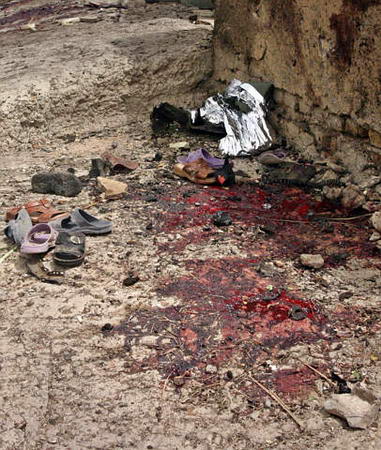 中新網(wǎng)7月14日電 據(jù)路透社報(bào)道,7月13日,巴格達(dá)發(fā)生一起汽車自殺炸彈爆炸事件,造成至少25人喪生,25人受傷,死者中包括許多兒童。圖為炸彈襲擊后,巴格達(dá)的街道上遺留的血跡和鞋子。(春風(fēng))