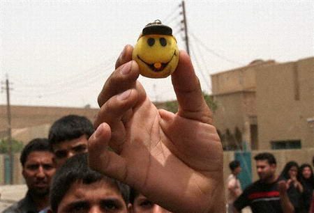 中新網(wǎng)7月13日電 據(jù)美聯(lián)社報(bào)道,7月13日,當(dāng)美軍向兒童分發(fā)糖果時(shí),遭到自殺汽車炸彈襲擊。襲擊造成了至少27人死亡,美國和伊拉克官員稱。一名美軍士兵和大約12名伊拉克兒童喪生。圖為伊拉克兒童在展示美軍贈(zèng)送的玩具。(春風(fēng))