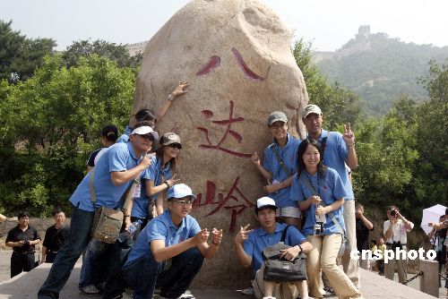 七月十四日,二○○五年臺(tái)胞青年千人夏令營營員游覽北京八達(dá)嶺長城。圖為營員們在長城上合影留念。作者:任海霞