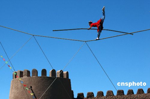 “達(dá)瓦孜”維吾爾語的意思是高空走大繩,古稱“走索”,是新疆維吾爾族傳統(tǒng)的民間雜技表演藝術(shù),源于兩千多年前的西域,據(jù)說在新疆也只有一個家族從事這項(xiàng)表演,多次創(chuàng)造吉尼斯世界紀(jì)錄的著名藝術(shù)家阿迪力就出生于新疆喀什地區(qū)英吉沙縣,是達(dá)瓦孜傳人。圖為在喀什維吾爾民族風(fēng)情園中表演達(dá)瓦孜的十二歲小姑娘,正在約三十米高的繩索上展示單腿平衡絕技。作者:田地