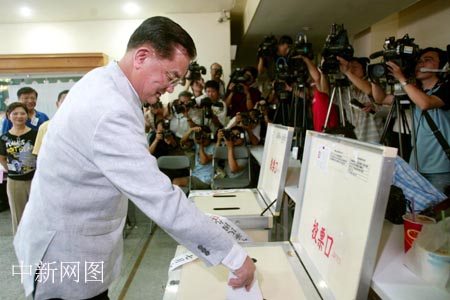 7月16日,中國(guó)國(guó)民黨主席選舉在全臺(tái)601個(gè)投票所展開(kāi),F(xiàn)任國(guó)民黨主席在居家附近的臺(tái)北復(fù)興中小學(xué)參加投票。中新社記者 盛佳鵬