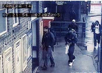 倫敦警察廳16日公布7·7爆炸案嫌疑人錄像,在這張盧頓車(chē)站錄像截圖上可看到:哈西卜·侯賽因(左一)、赫爾馬因·林賽(左二黑帽)、穆罕默德·西迪克·汗(白帽)和謝赫扎德·坦維爾在7月7日晨7點(diǎn)21分背包進(jìn)車(chē)站,此后四人在國(guó)王十字車(chē)站各自走上不歸路