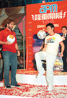 中新網(wǎng)7月18日電 據(jù)香港媒體報道,“藝壇天王”劉德華與“球壇巨星”坎通納(Eric Cantona)昨日在apm商場開幕典禮上碰頭。九十分鐘的賽事,上半場華仔占主場之利,先聲奪人,下半場坎通納拿用毛筆寫中文字夠創(chuàng)意。加時,華仔使出必殺技“劉氏墨寶”,坎通納回敬“曼聯(lián)簽名”,打成平手,和氣收場。