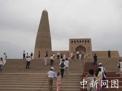 位于吐魯番市東郊2公里處的木納格村,全國(guó)重點(diǎn)文物保護(hù)單位。蘇公塔,又名“額敏塔”,建成于1777年,是新疆現(xiàn)存最大的古塔,至今已有200多年的歷史。蘇公塔是清朝名將吐魯番郡王額敏和卓的次子蘇來曼,為紀(jì)念其父的功績(jī),表達(dá)對(duì)清王朝的忠誠(chéng),自出白銀7000兩建造而成的。蘇公塔高44米,基部直徑10米。塔身上小下大,呈圓錐形。塔中心有一立柱,呈螺旋形向上逐漸內(nèi)收直至塔頂,共有臺(tái)階72級(jí)。塔系磚木結(jié)構(gòu)。在不同方向和高度,留有14個(gè)窗口,塔身外部有幾何圖案15種之多,可謂精妙絕倫。蘇公塔造型別具一格,莊嚴(yán)、古樸,具有濃郁的伊斯蘭風(fēng)格,是吐魯番著名的旅游景點(diǎn)之一。1961年,蘇公塔經(jīng)歷了12級(jí)大風(fēng)的考驗(yàn),安然無恙。為了以防不測(cè),妥善保護(hù)古塔,目前在塔體外加了三道鐵箍固定它。