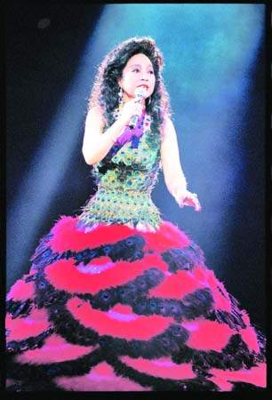 小鳳姐在演唱會(huì)上每每都以大型傘裙特顯其纖腰。這條用羽毛做成的大型傘裙,顏色鮮艷,纖纖細(xì)腰表露無(wú)遺。