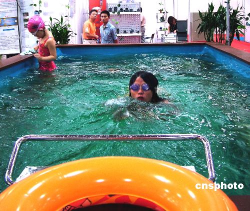 7月21日,在2005中國上海國際環(huán)保工業(yè)展上,最新亮相的“游泳跑步機”吸引了觀眾注意。這座游泳跑步機需要2.6M0*5.2M的安裝空間,出水速度可選擇,水凈化設(shè)備可保障池內(nèi)水長期循環(huán)使用。作者:井韋