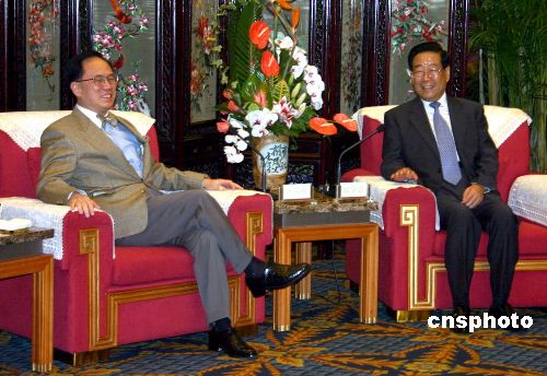 香港特首曾蔭權(quán)率領(lǐng)政府代表團(tuán)于7月24日抵達(dá)成都,出席將于25日開(kāi)幕的第二屆“泛珠三角區(qū)域合作與發(fā)展論壇”。中共四川省委書(shū)記張學(xué)忠(右)下午會(huì)見(jiàn)了曾蔭權(quán)一行。作者:楊杰